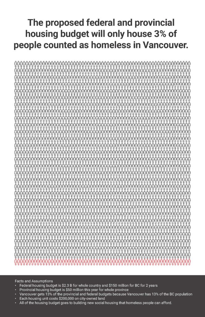 And the province? They have announced a $50 million contribution to social housing this year, portraying the amount as historic. But $50 million will only build 250 units on city owned land across the province. In the 70s and 80s, about 2000 units of social housing were built annually in BC. If Vancouver, with 13% of the province’s population, got 13% of the provincial housing money this year, that could build about 33 units. 33 units to house 1847 homeless people.