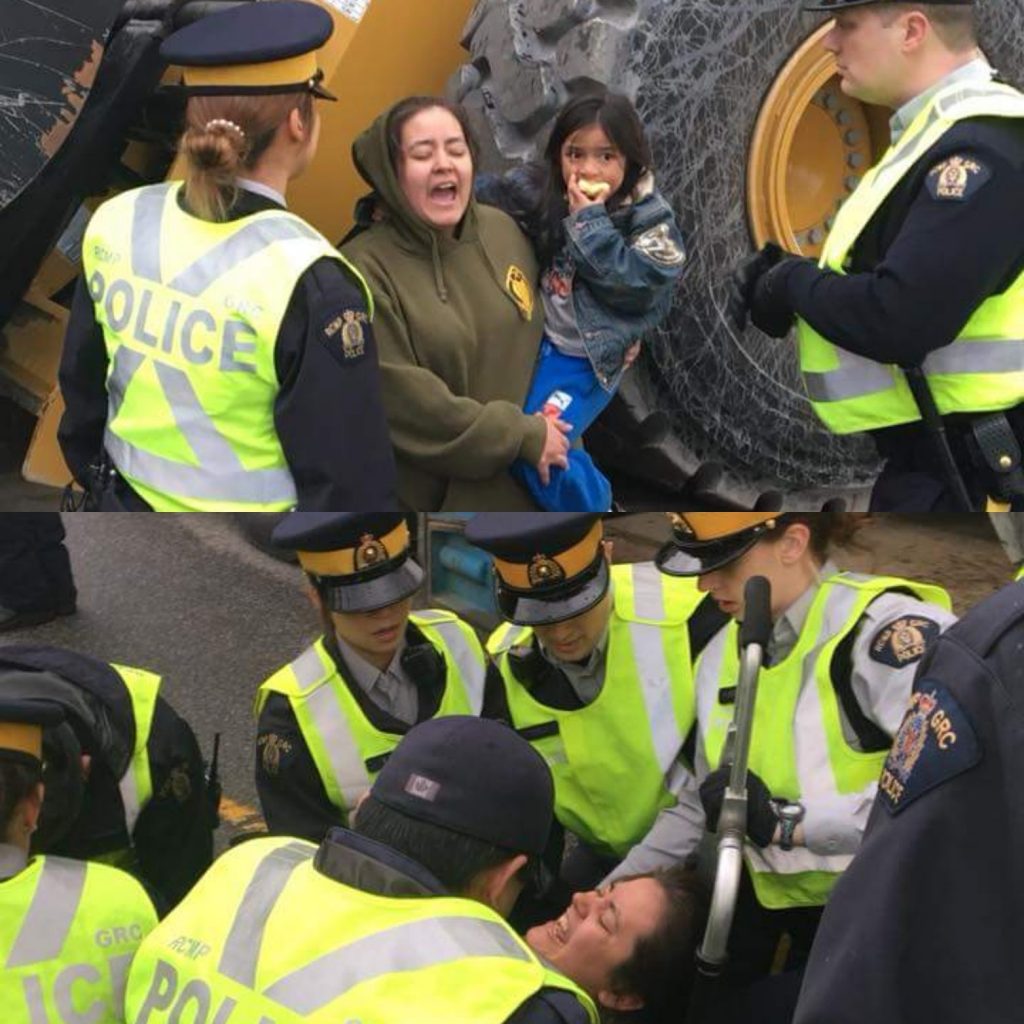 Crystal Smith went up to Burnaby Mountain with her mother and two children. They blocked a work truck with others. “I was standing on the side when two police officers approached me. I asserted my inherent rights as a Tsimshian and Haisla woman,” she explained after getting out of jail. “Within seconds I heard my mother, who was being physically harmed by the police, and my son who had just left my arms. I struggled as I watched my kids who were scared and I tried to get to them, but the police forced me into a stretcher. What was clear to me that day was how the police were so much more violent in their treatment of Indigenous bodies.”