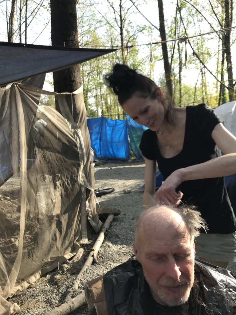 Ordinary life in the tent city – Nicole cuts Colin’s hair a year after the police raids
