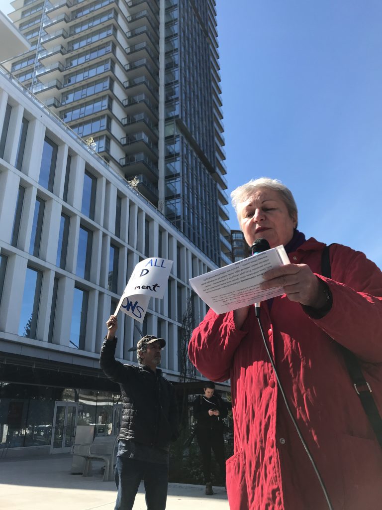 Erika Schinzel, a tenant who lives in 6366 Cassie Ave. and has previously been heavily involved with Stop Demovictions Burnaby, spoke of her own situation and in support of the tenants in her building who were not able to attend. She said, “Love, trust and community – these things can’t be designed, they need to be developed”; and explained that the City of Burnaby is responsible for destroying these communities. But communities are powerful, and the collective power that standing together with neighbours creates can thwart the City’s attempts to destroy those very bonds. In many cases, it can be the very act of coming under attack that can bring tenants closer to their neighbours, as they truly realize the power they have to fight back.