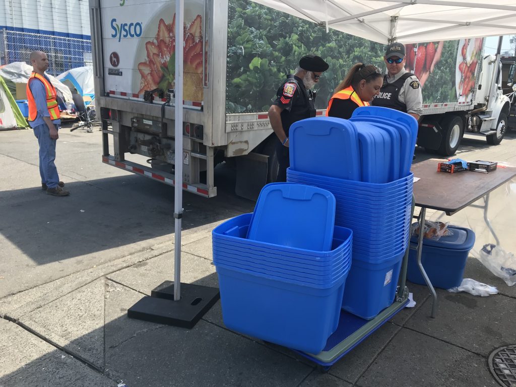 Moving day started the morning of Tuesday June 19th with Bylaw officers closing each end of the street and outreach workers distributing bins to campers up and down the Strip. Bonnie, a long-term resident of the Strip said, “Bylaw officers told us that after the Strip is cleaned up, homelessness is going to be illegal.” Another resident of the Strip who overheard Bonnie said that an RCMP officer told him that after the 160 units are full, they will send the riot squad down the strip to clear out any tents that remain. Regardless of the truth of these statements, the fact is that officers are sending a message that after the orchestrated move is finished, RCMP and Bylaw will stop anyone from setting up a tent on 135A again.