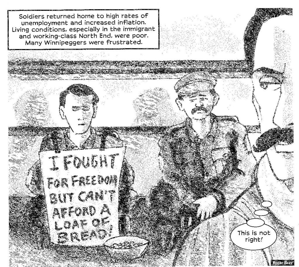 The disillusion of working class soldiers with the “senseless slaughter” overseas, and the lack of future awaiting them upon return was certainly another condition for the feelings of solidarity that undergirded the strike. But Lester also refers to a speech by carpenter union and Socialist Party organizer George Armstrong, specifically noting the growth in the Canadian economy brought by the war and invoking the workers’ entitlement to a share of this profit. The Canadian ruling class was not willing to cut a deal along these lines yet, and opted to crush the strike with brute force instead, but the deal would come after another couple decades of class strife and a second World War.