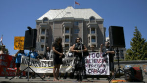 On Tuesday June 28th, Victoria, British Columbia took centre stage in Canada’s housing crisis. While the Province mounted a second attempt to displace Super InTent City by court injunction, all of Canada’s Provincial and Territorial ministers of housing met the Federal housing minister Jean-Yves Duclos blocks away in the Hotel Grand Pacific. In response, housing justice and anti-displacement activists converged to expose Trudeau’s do-nothing housing policies and to deliver the Ministers two major demands, summarized by banners that flew at the rally reading “Hands off Super InTent City” and “Build 77,000 Homes Now.”