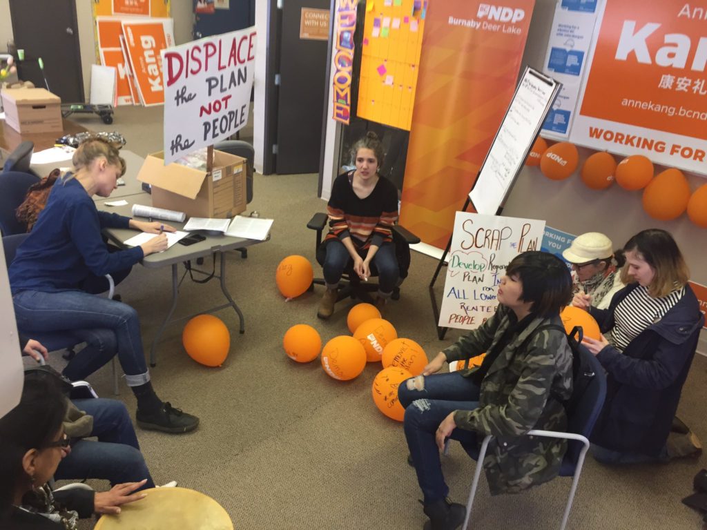 Over the years of organizing to raise the issue of the demovictions crisis in Metrotown, we have learned that all the formal avenues of dialogue in Canadian and B.C. politics are designed to silence the evicted, while broadcasting the perspectives of the evictors. That is why we showed up unannounced and with traditional drums to make a point. Demovictions are silencing and displacing our community, and for Indigenous residents they are an example of ongoing colonization. We approach the NDP because of your claim to be the party of the people, not the developers. We approach the NDP because we want you to win the election with a strong working class oriented platform and with people-backed candidates. But we fear that the NDP’s hostility to us at Kang’s office means you are turning your back on renter, working class, and Indigenous communities – that the NDP, in lock step with the BC Liberals, are trying to bury the issue of homelessness, and stigmatize and criminalize dissent.