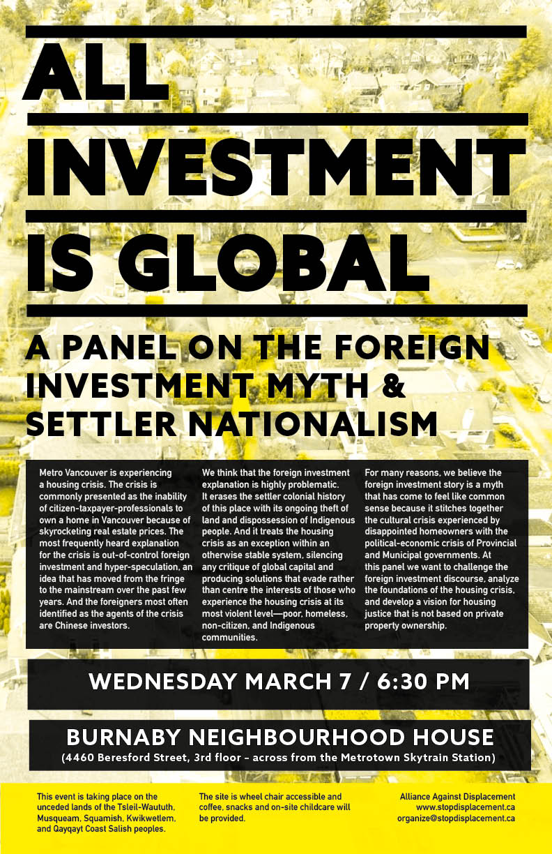 The first monthly podcast of The Volcano focuses on critiques of the foreign investment myth, which has come to dominate conversations about the housing crisis especially in the Lower Mainland, across British Columbia, and in Canada more widely. The podcast is based on talks given by listen chen, Isabel Krupp, and Ivan Drury at an Alliance Against Displacement panel called “All Investment is Global: A public panel on the foreign investment myth” held at Burnaby Neighbourhood House on March 7, 2018.