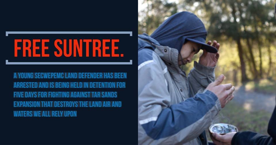 Suntree Johnson Larue travelled from his home territory to stand with Coast Salish peoples against Kinder Morgan. Over half the length of the projected TransMountain pipeline lays across his Secwepemc territory in the interior. He was arrested over an action on the night of March 19th in which land defenders blocked a truck at the worksite for several hours. He was upset at witnessing police being rough and disrespectful with elders in the process of detaining them. The RCMP and Crown held him for six days over the Easter weekend.