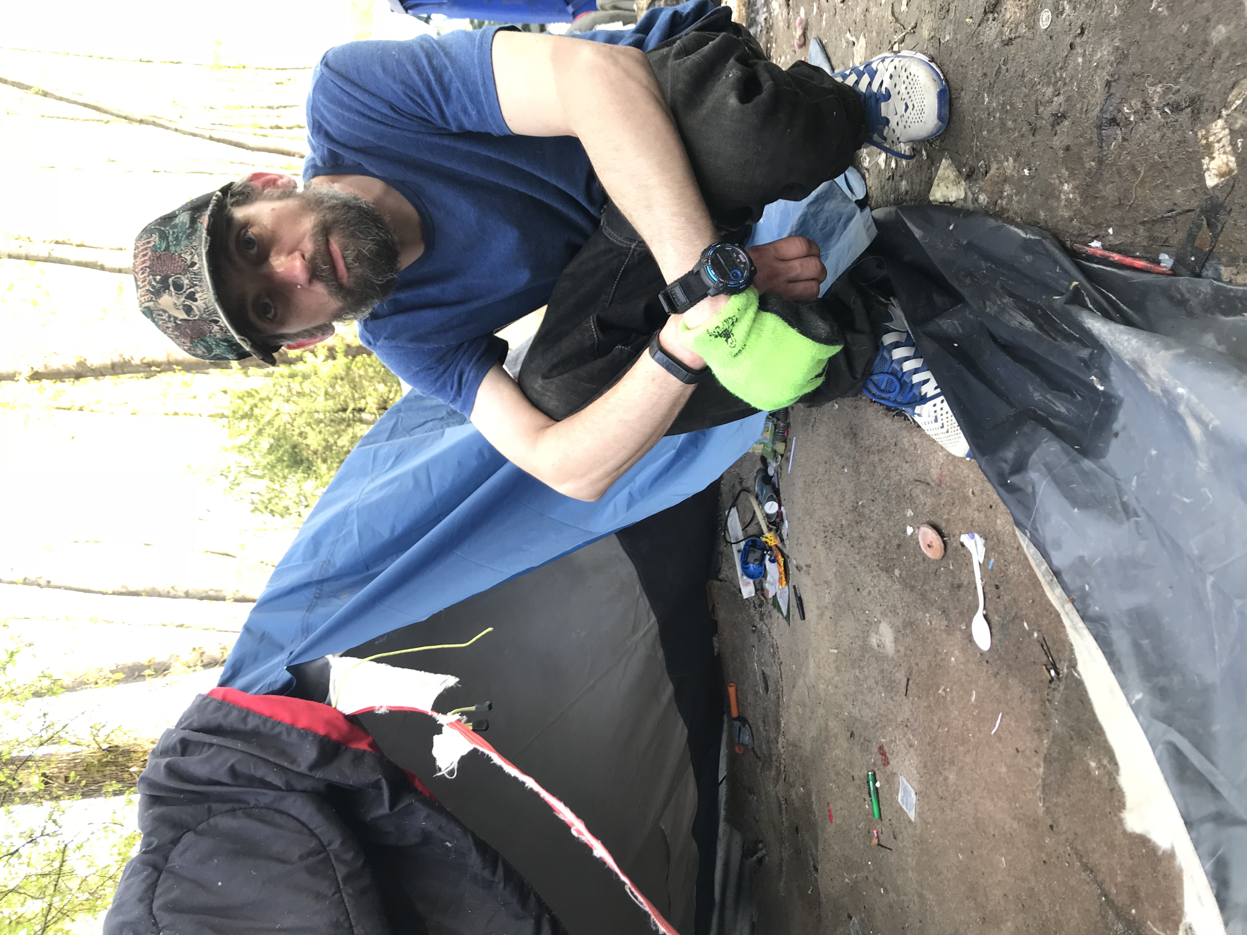 Joe was one of the first people to move into Anita Place. He is a builder. Joe’s tent is lifted up on a platform that he dug out, and is neatly and cleanly contained under a tarp and awning. He also collects things and keeps a small tent beside his with tools and supplies organized inside it. Joe’s tent is a secondary community space. He is someone who people in camp go to for things they need, for help setting up a tarp, or for advice. He is a quiet, backroom leader who is always watching and listening to what is going on, and thinking about what should be done.