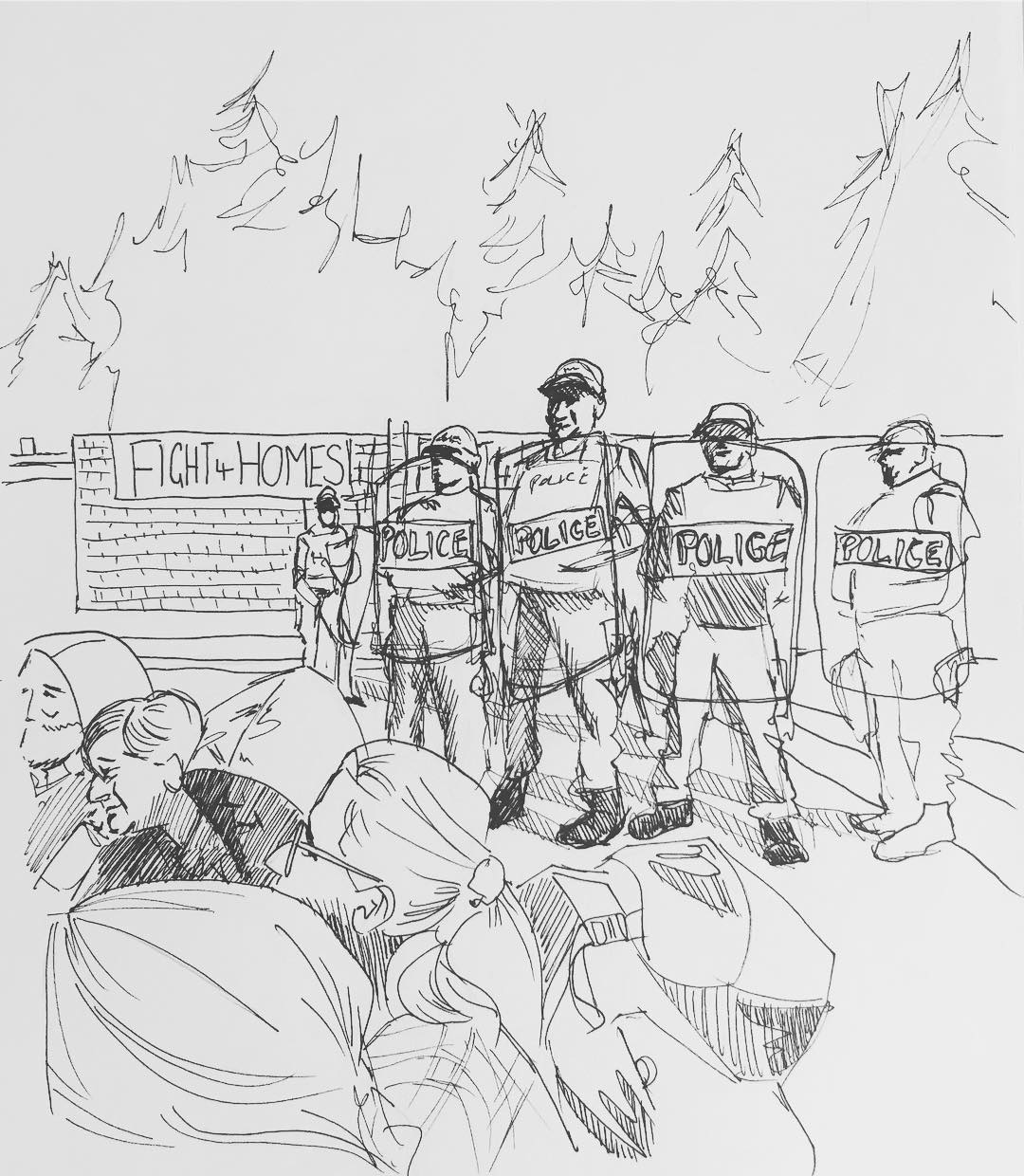 On Saturday morning, as we linked arms in a circle on the roof and saw the Emergency Response Team (Canadian equivalent of a SWAT team) approach, a powerful and lasting sense of solidarity fell over us. Far from feeling defeated, we used the last hour to cheer for each other and chant: “Fight for homes! Fight for justice!” When the police managed to pry one of our comrades out of our circle, we added their name to the chant: “ Fight for homes! Fight for justice! Fight for Sophie!” What we built together is what we will continue building: we refuse to comply to state oppression rooted in colonialism and capitalism, and will keep fighting back for the creation of our own world. As Rod described, the feeling that defined the Schoolhouse Squat was the feeling of “sitting in the circle in solidarity. Fighting to stay together, drawing strength from each other. Knowing that we wouldn’t last forever but fighting anyway.”