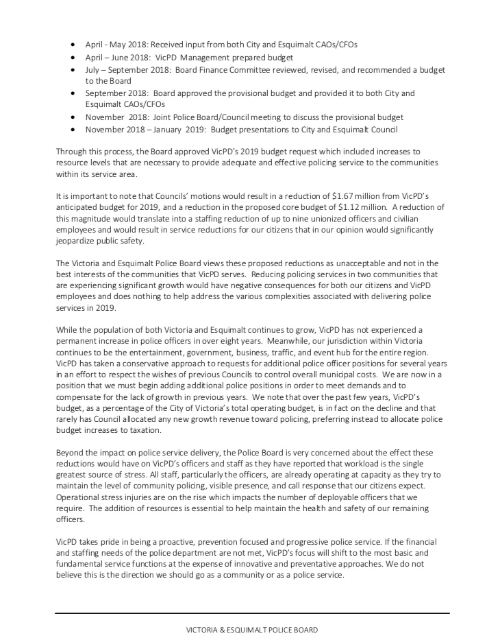 In this letter, the Board claims that this budget increase would, because it is approximately half of what was originally asked for, necessitate a staffing reduction of up to nine VicPD officer/civilian positions resulting in reduced services that would “significantly jeopardize public safety.” Additionally, the Board expressed concern about VicPD workload and stress levels as “[a]ll staff, particularly the officers, are already operating at capacity as they try to maintain the level of community policing, visible presence, and call response that our citizens expect.”