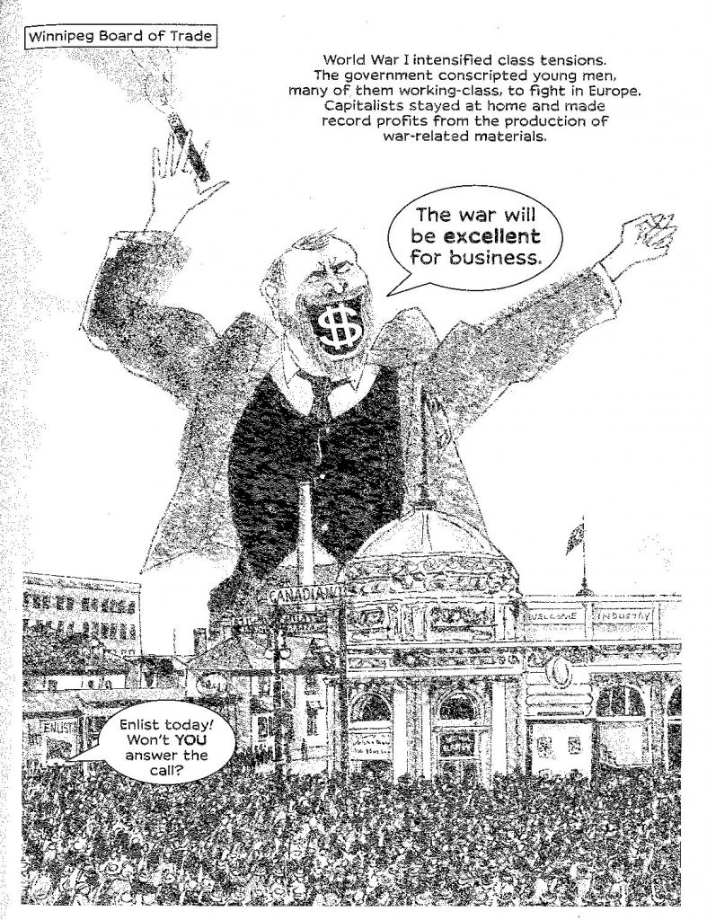 The disillusion of working class soldiers with the “senseless slaughter” overseas, and the lack of future awaiting them upon return was certainly another condition for the feelings of solidarity that undergirded the strike. But Lester also refers to a speech by carpenter union and Socialist Party organizer George Armstrong, specifically noting the growth in the Canadian economy brought by the war and invoking the workers’ entitlement to a share of this profit. The Canadian ruling class was not willing to cut a deal along these lines yet, and opted to crush the strike with brute force instead, but the deal would come after another couple decades of class strife and a second World War.