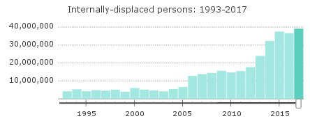 According to the UN Refugee Agency, there are now more displaced people worldwide than ever before. In 2017, the most recent year with data, there were 68.5 million refugees, stateless people, and internally-displaced people on earth. This third category of “internally-displaced people” [IDP] is the largest, accounting for two-thirds of people displaced, but is likely a drastic under-estimate because the numbers of people displaced “legally,” through gentrification, for example, are not tracked by states or non-state groups. The number of internally displaced people has exploded since 2010, and the number of refugees has been rising every year since 2012.