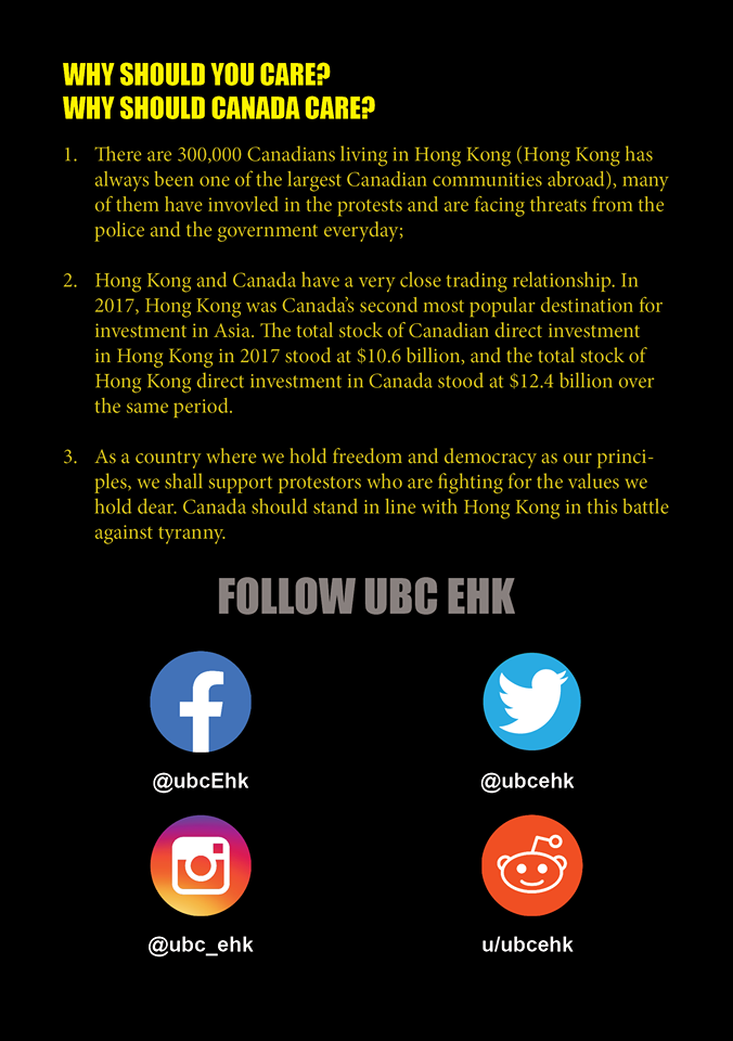UBC-EHK’s myopic framework sidesteps the hard and necessary work of mapping out the material grounds for solidarity with the movement in Hong Kong. Rather than looking around for activists in Canada that similarly face state repression, they instead rely on a fantasy of freedom and democracy that covers up Canada’s genocidal violence, both here on Turtle Island and abroad. But the Chinese and Canadian states do not need one another as foils in order for their hypocrisies and violences to be exposed, because they are part of a global system. The basis of solidarity with Hong Kong must instead rely upon a strong, anti-imperialist lens—one that opposes rising sinophobia and yellow peril discourse while simultaneously advocating for the protection and expansion of rights and freedoms for working class people in Hong Kong and mainland China.