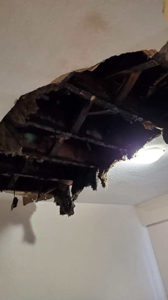 On February 10th the ceiling gave away in multiple units at 6650 Dow Avenue, revealing widespread black mould and rotten wood in the roof. For more than three weeks tenants have tried to get the ceiling repaired, with their then-investor/landlord Matchpoint Development only responding to their requests after several tenants spoke to CTV news on March 4th.